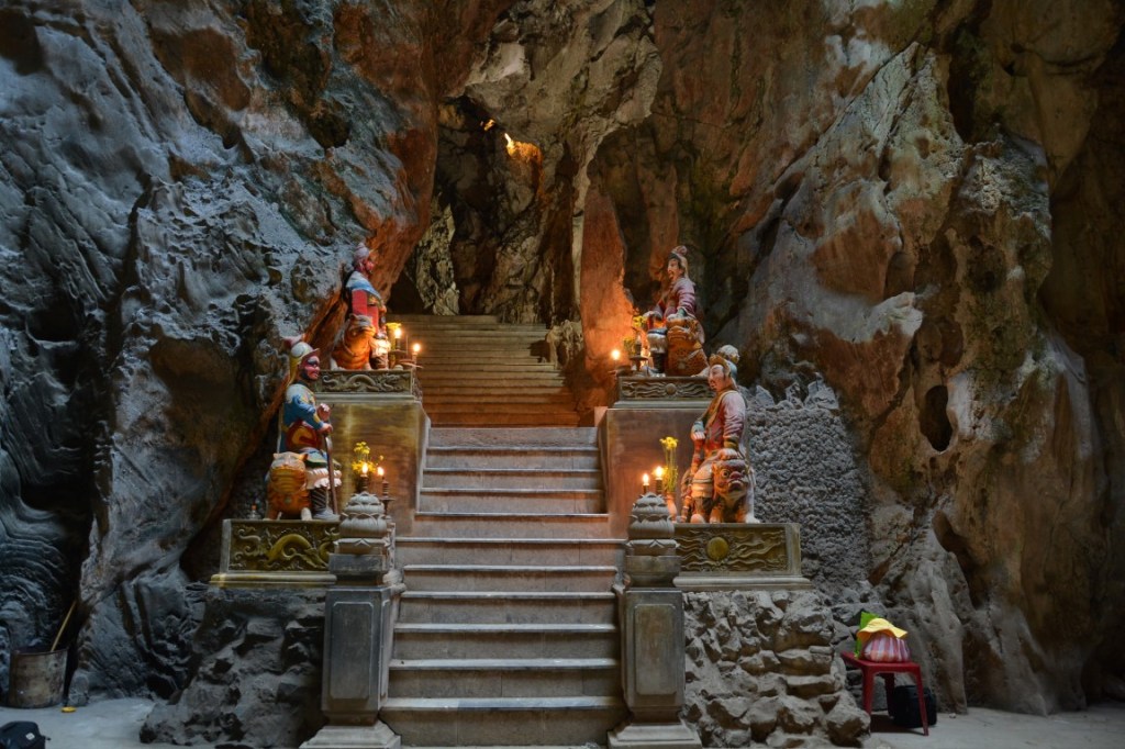 Von Hue aus ging es weiter südwärts in Richtung Hoi An. Der beeindruckendste Zwischenstopp auf der Fahrt dorthin waren die sog. Marble Mountains, riesige Felserhebungen inmitten der sonst flachen Stadt von Da Nang, gespickt mit malerischen Höhlen und Pagoden.