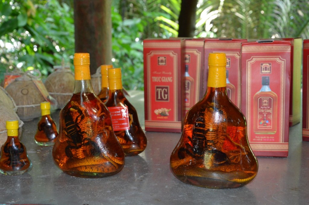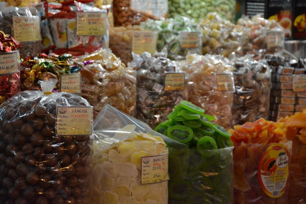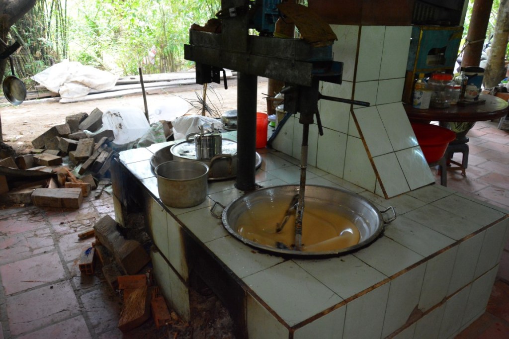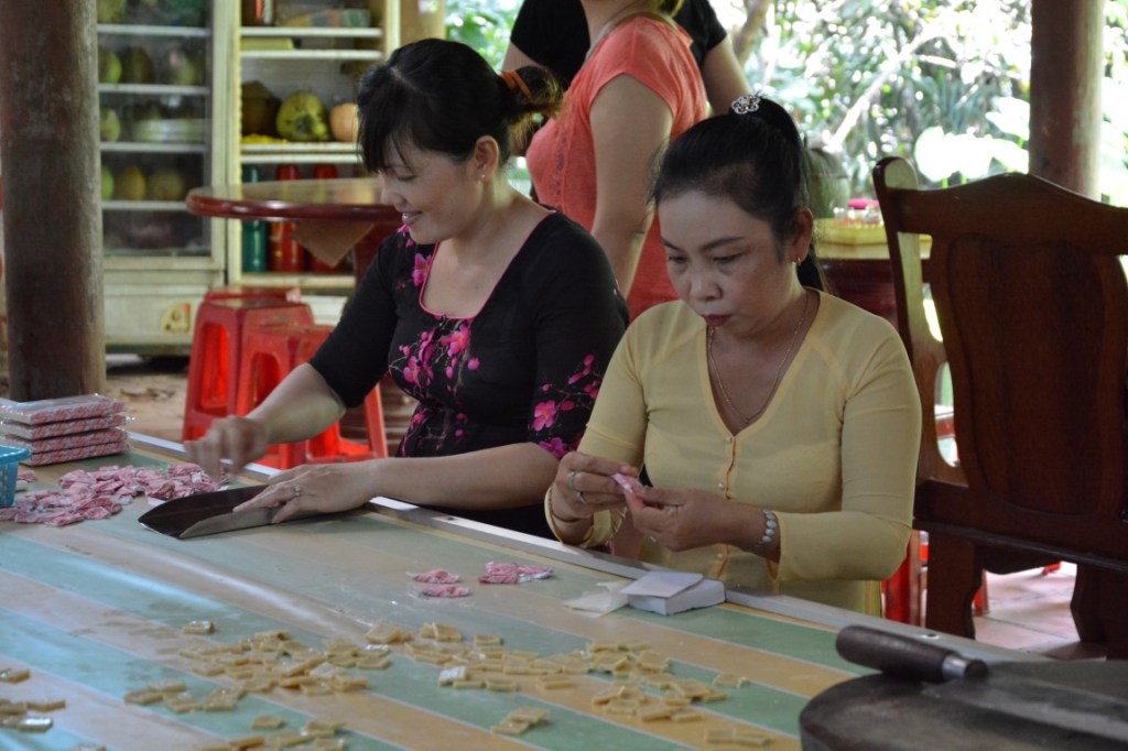 Von Saigon aus haben wir einen Tagesausflug in Mekong-Delta gemacht – anscheinend haben wir auf einem der Arme des Mekong-Deltas die Rushhour erwischt. 🙂 Bei dem Ausflug wurde uns unter Anderem gezeigt wie Bonbons aus Kokosnüssen hergestellt werden. Super-lecker übrigens! Und natürlich habe wir gleich 2 Packungen gekauft . Allerdings mussten wir sehr schnell feststellen, dass ein wenig Mitdenken nicht geschadet hätte: Wenn die Bonbons nämlich ein bisschen abkühlen (<40°), dann sind sie (immer noch lecker, aber) unglaublich klebrig, zäh und hart. Da wir wirklich, wirklich, wirklich auf dem Sabbatical keine Lust auf Zahnärzte haben, und die Teile gefährliche Plombenzieher sind, haben wir uns dazu entschlossen die Bonbons zu verschenken.