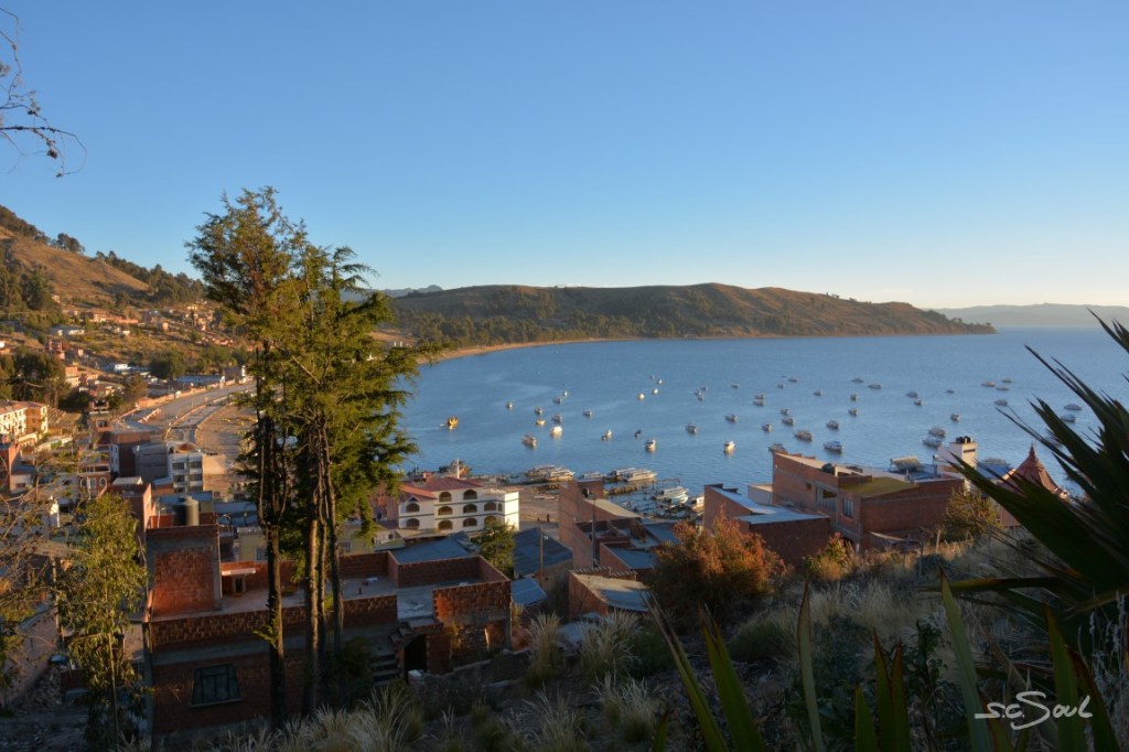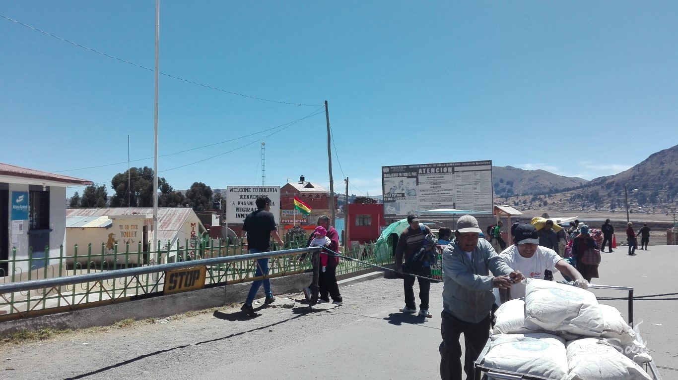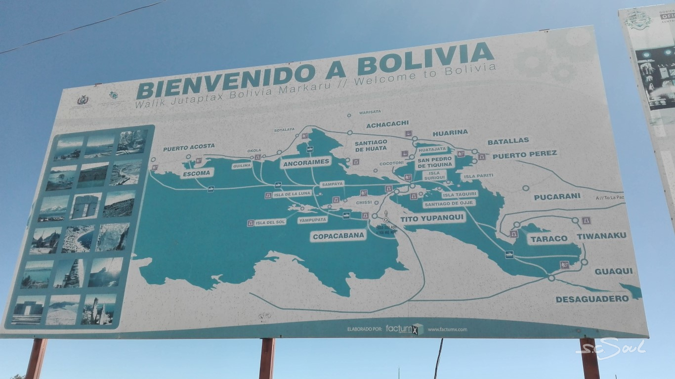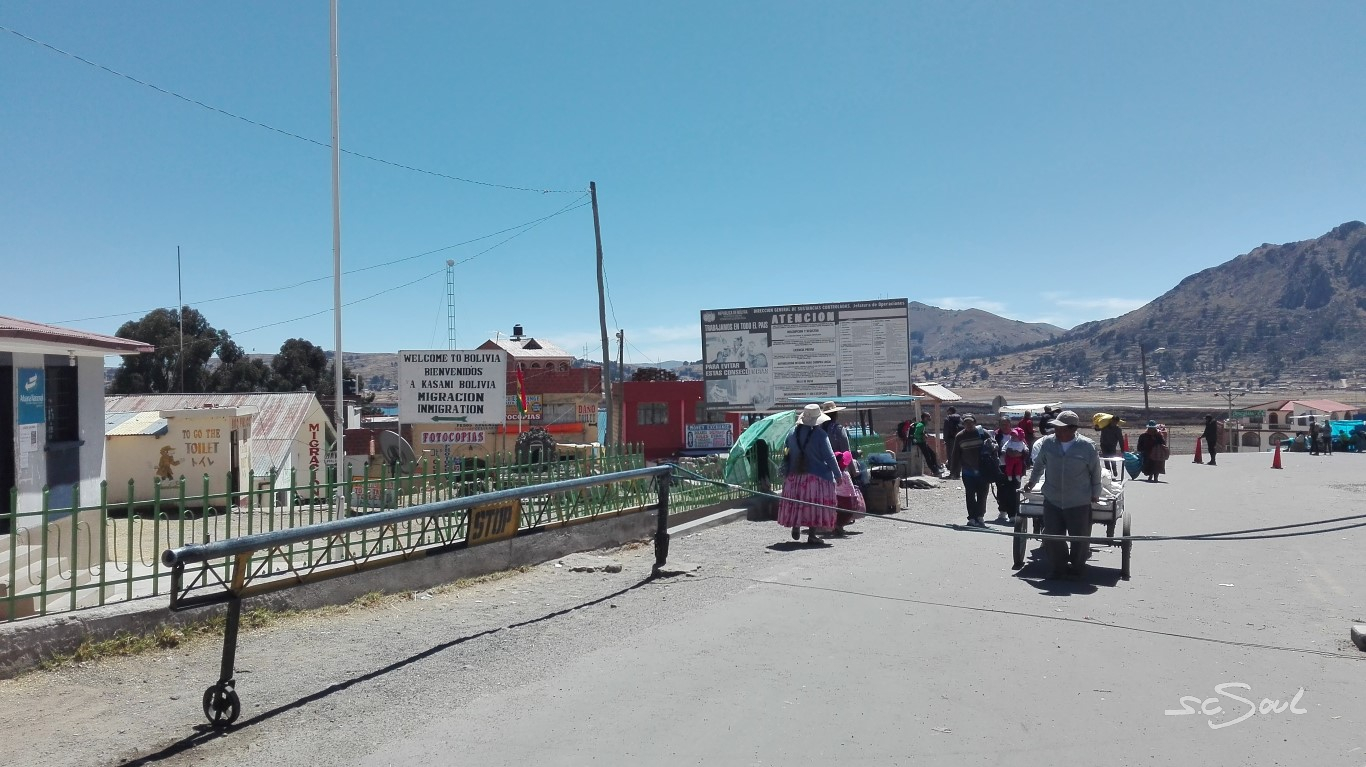 Aus Peru kommend ging es für uns per Linienbus über die peruanisch-bolivianische Grenze nach Copacabana. Für Aus- und Einreise muss man kurz aus dem Bus aussteigen, seine restlichen peruanischen Soles in Bolivianos tauschen, sich seinen Ausreisestempel holen, und in Bolivien wieder „einstempeln“. – Das Ganze war extrem schnell erledigt; trotz vollbesetzem Bus saßen wir nach gerade einmal 15 Minuten wieder in selbigem.