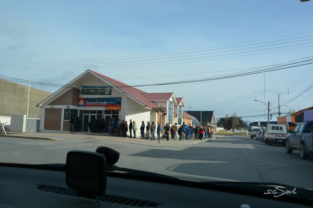 Tankstellensuche ist hier unten nicht ganz einfach, das wussten wir. Deswegen sind unsere beiden Ersatzkanister randvoll. – Doch Geld zu bekommen ist noch schwerer: An den Bankomaten stehen Schlangen (wenn sie nicht ausgefallen sind) als ob das Geld umsonst wäre, und unsere deutschen Kreditkarten funktionieren auch nicht mehr. Infrastruktur in der Pampa hat Russland irgendwie besser hinbekommen als Argentinien und Chile. Unnötig zu erwähnen dass man, wenn man mal das Glück hat eine größere Bank mit funktionierendem Geldautomaten zu erwischen, für den maximal Abhebebetrag von umgerechnet 120€ immer mindestens 6€ Geldautomatengebühr bezahlt…