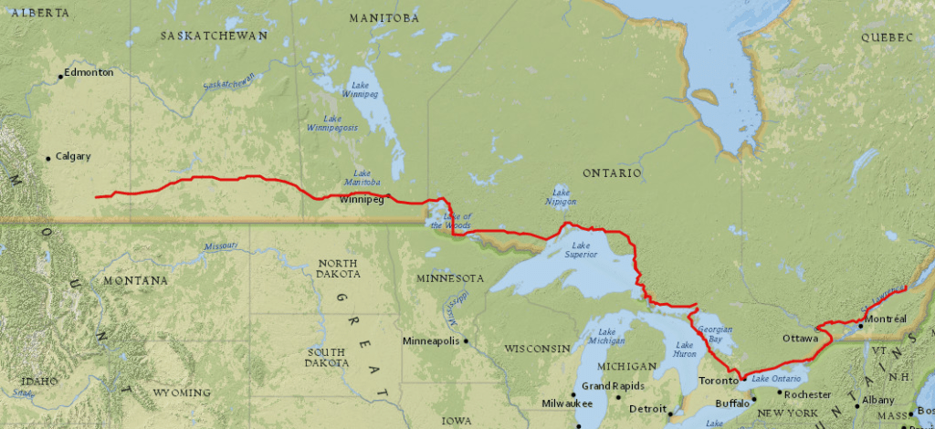 Ab Grand Falls über die Städte in Québec und Ontario bis nach Medicine Hat in Alberta sind wir 4.700 km in 12 Tagen gefahren. Auch hier waren wir schneller als die Planung (6.200 km / 18 Tage), und habe nicht ganz so viele Kilometer zurückgelegt.