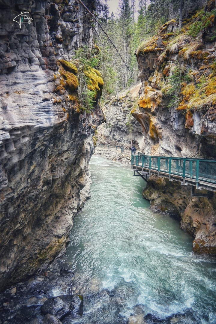 Anschließend ging es zum ersten der Campingplätze am Johnston Canyon. Dort haben wir unseren Bus abgestellt, und haben die erste „größere“ Wanderung in Angriff genommen: Johnston Canyon, und weiter zu den Ink Pots. Sagen wir es so: Den unteren Wasserfall (nach ~700 m one-way) machen fast alle; den oberen Wasserfall (nach insgesamt 1,2 km one-way) nur noch 30%; und das eigentliche Highlight, die Ink Pots oben (nach insgesamt 6 km one-way) deutlich unter 1 Prozent. 😉