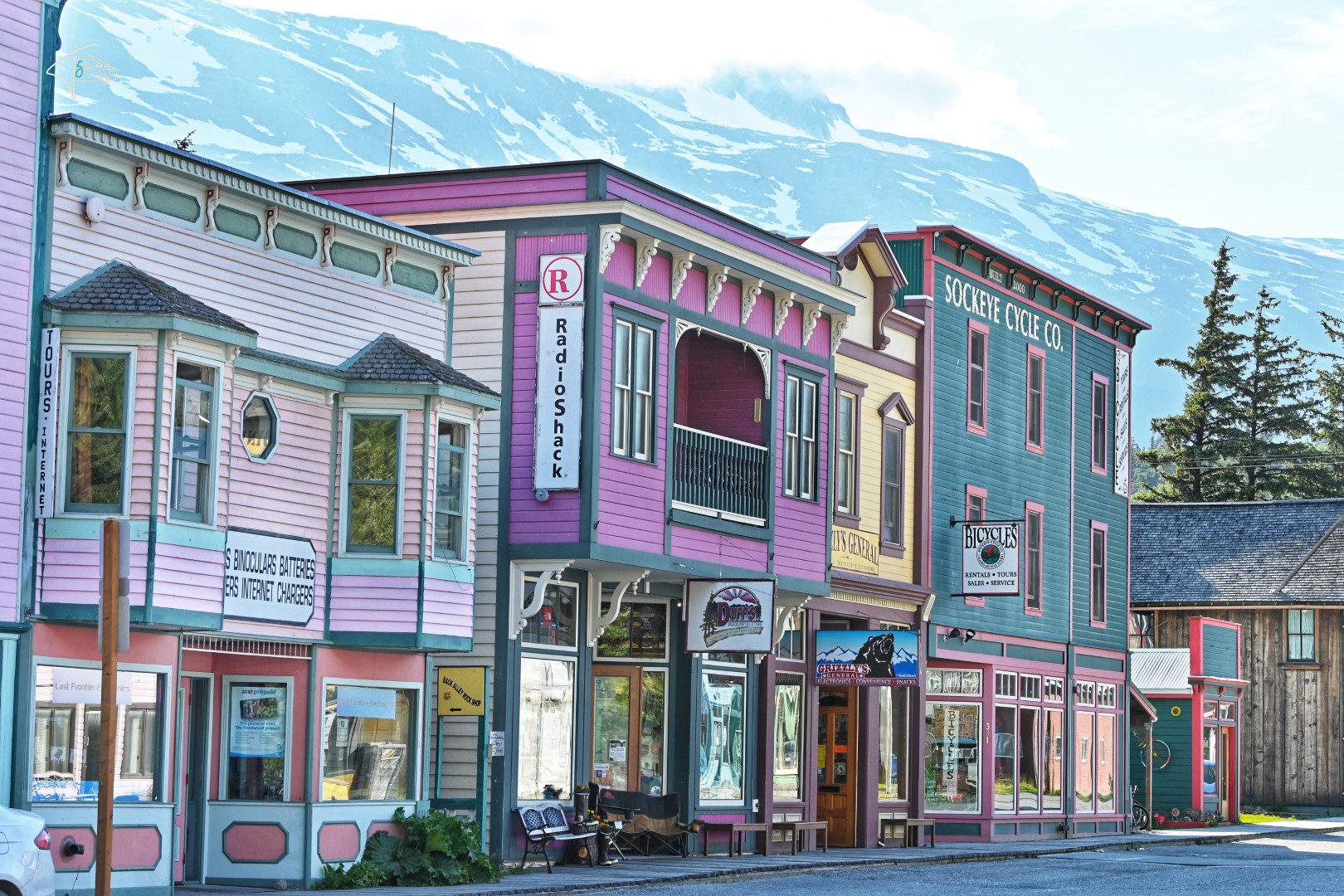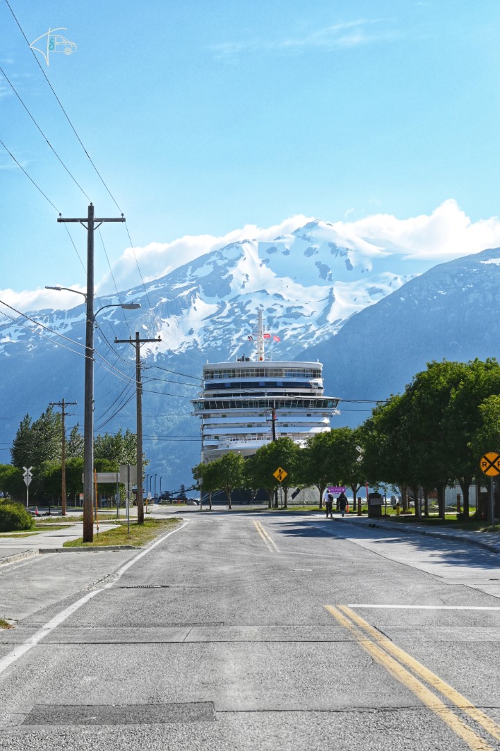 Skagway (und auch Haines) sind verschlafene ehemalige Fischerorte, die sich heute hauptsächlich durch den Kreuzfahrttourismus in der sog. Inside-Passage finanzieren. So war es erwartbar, aber trotzdem leider sehr befremdlich als wir aus der Einsamkeit der Gletscherpassage kommend, mehr oder weniger unerwartet plötzlich zwei riesen Kreuzfahrtschiffe in dem relativ kleinen Hafen von Skagway gesehen haben. Wahnsinn wie diese Teile die Landschaft verschandeln – und wie wohltuend als um 17.00 Uhr alle Kreuzfahrt-“Abenteurer“ pünktlich zum Dinner endlich wieder auf ihren Kolossen waren.
