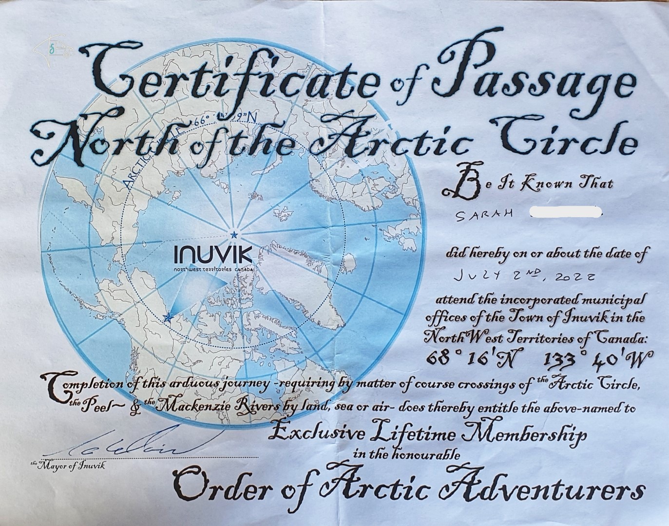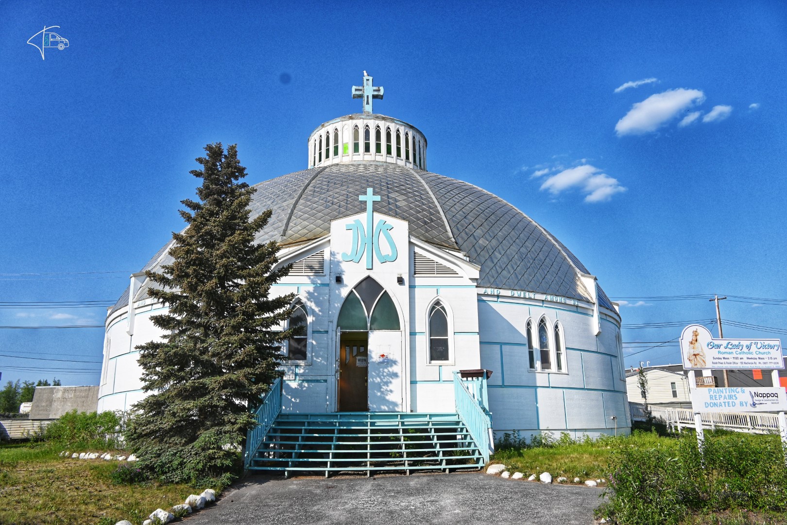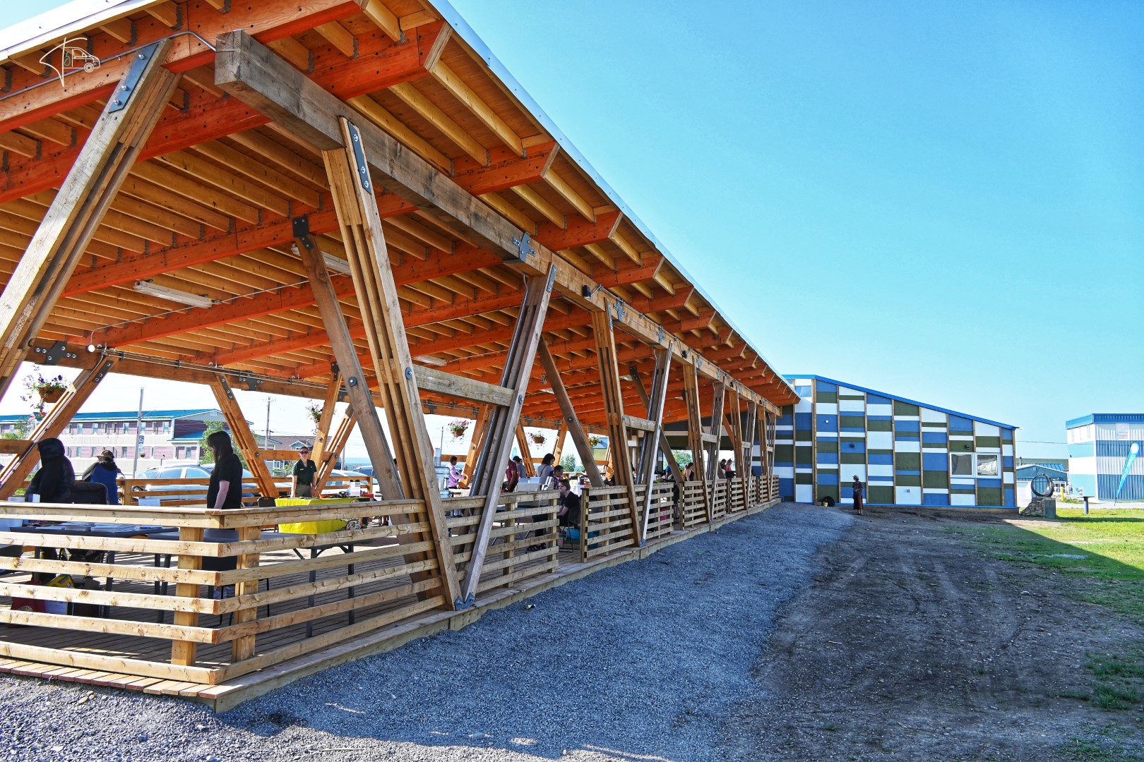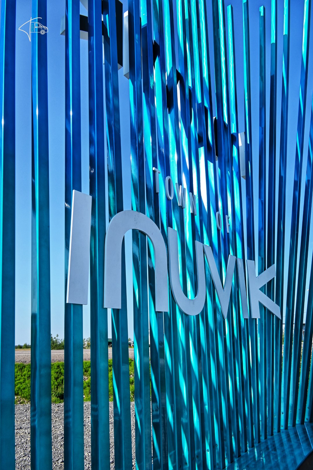 Alles in allem war die weitere Fahrt bis Inuvik sehr schön, auch wenn wir doch etwas angespannt waren. In Inuvik haben wir auf einem Campingplatz übernachtet, der uns auch mal wieder annehmbare Duschen beschert hat. Am nächsten Morgen haben wir den lokalen Markt in Inuvik besucht, 2-3 Souvenirs geshoppt, ansonsten gibt es in der Stadt nicht viel zu sehen, außer der Iglu-förmigen Kirche und dem äußerst stylischen Stadtlogo. Was man hier an den Häusern sieht, Inuvik ist wieder eine Stadt auf Permafrost-Boden. Hier sind die Leitungen alle oberirdisch verlegt und alles steht auf Stelzen. Lustig ist auch, dass man sich hier sein „Arctic Circle“-Zertifikat abholen kann.