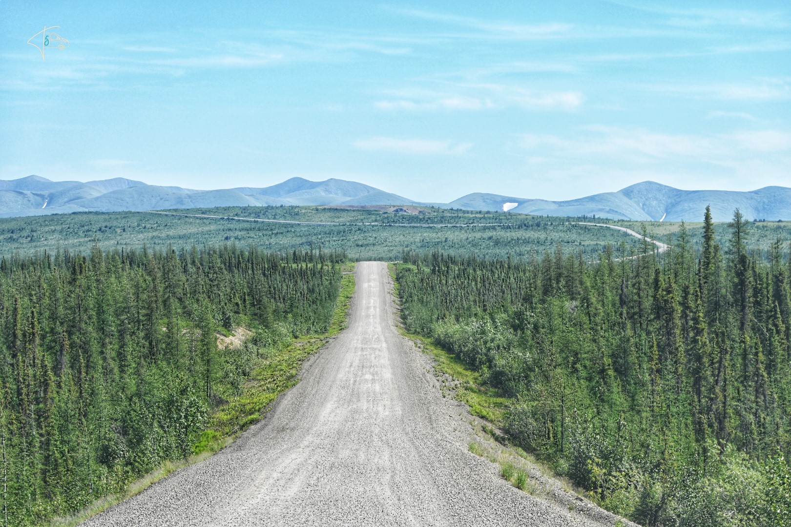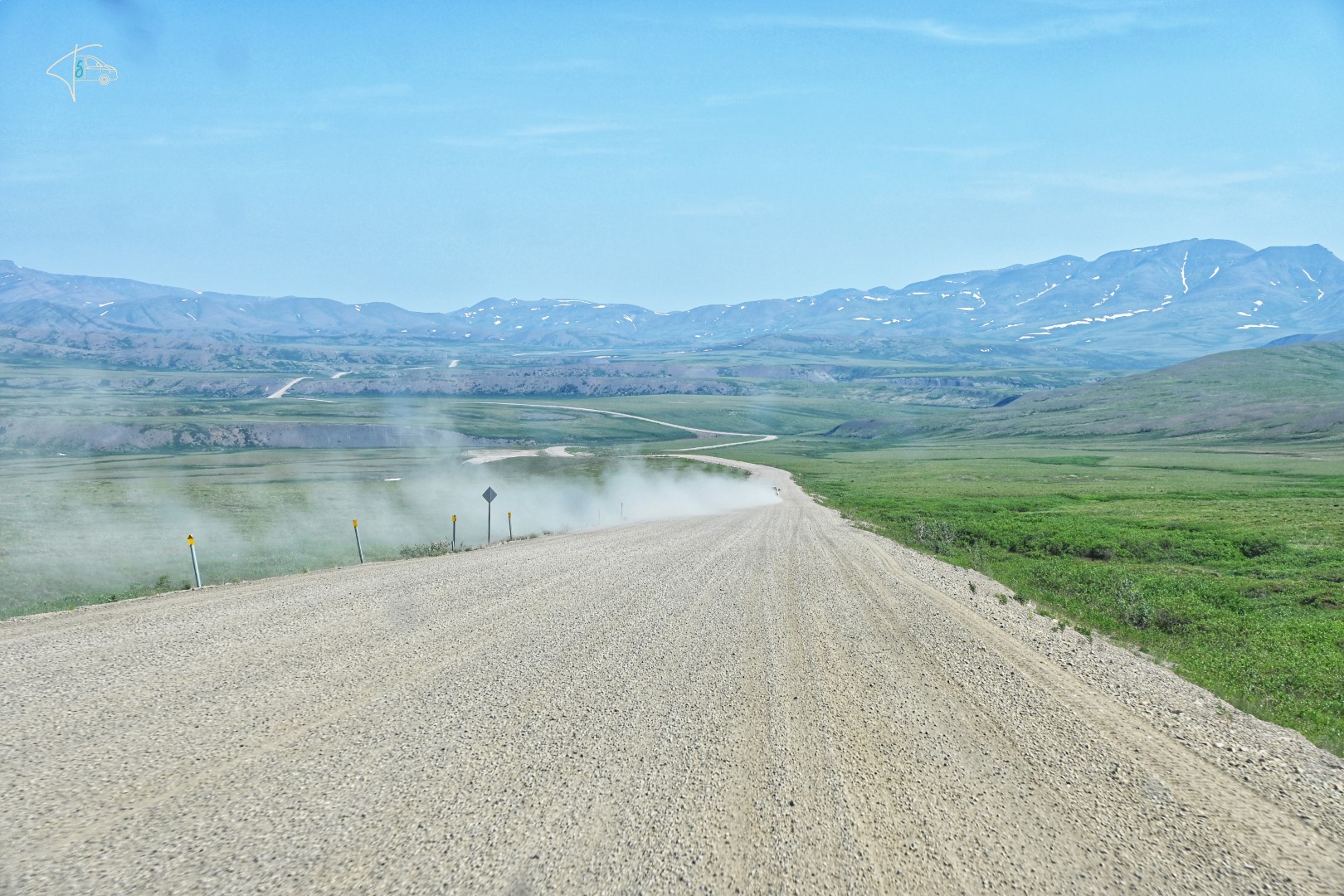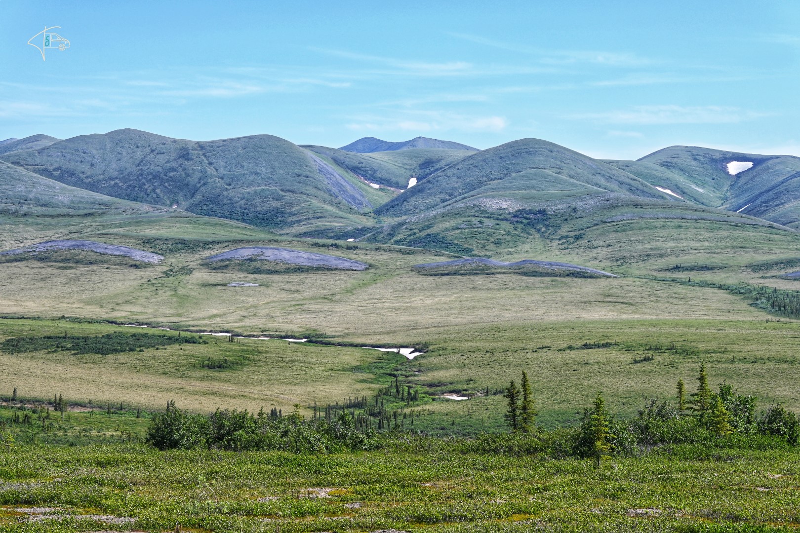 Ab dem Polarkreis Richtung Norden wurde der Rauch immer weniger, die Luft besser, aber die Aussichten leider auch unspektakulärer. Auf dem Weg nach Inuvik gab es nochmals zwei Fährüberfahrten. Vielleicht erwähnenswert: Die notwendigen Fähren, die Straßen komplementieren (also auch die Fähre direkt bei Dawson City), sind immer kostenlos. Weiterer positiver Nebeneffekt, gerade auf dem Dempster Highway durchs Niemandsland: Dort gibt es für ein paar Minuten so etwas wie Zivilisation (3 Häuser und eine Tankstelle), und auch Handynetz. 😉 Wichtigstes auf dieser Straße – Abstand halten! wenn man nicht komplett eingestaubt werden will oder die Kiesel des vorherigen Fahrzeuges abbekommen will. Wir hatten jedoch Glück, es hatte länger nicht geregnet und die Straßenbedingungen waren daher relativ gut.