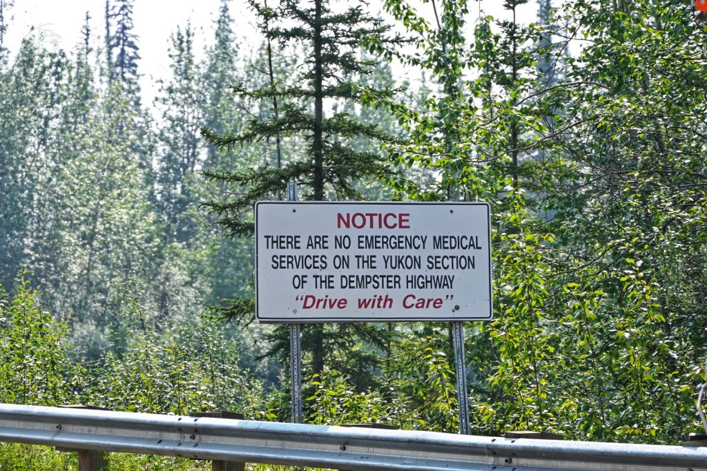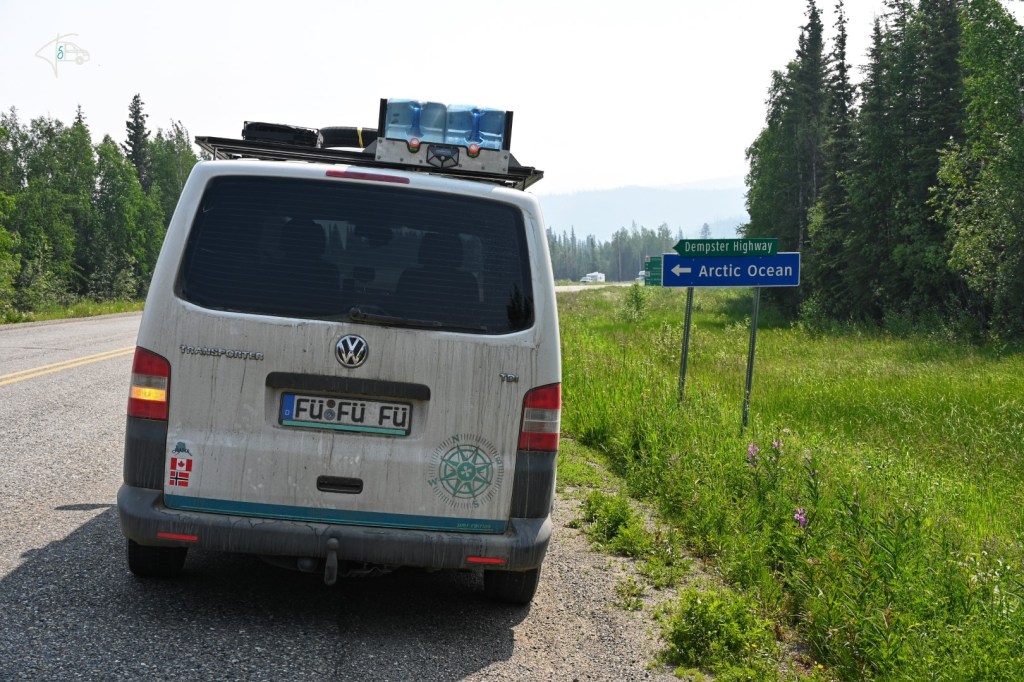 Wir selbst waren heiß und gespannt auf unser nächstes Ziel nach Dawson City. Den legendären Dempster Highway nach Inuvik. Früher gab es Aufkleber die hießen „I survived the Alaska Highway“. Diese gibt es heute mit dem Dempster Highway. Wir hatten ziemlich lange Hin und Her überlegt, ob wir diese Strecke fahren sollen. 736 km Schotterstraße bis nach Inuvik in den Northwest Territories, die bei Regen schnell zur Schlammschlacht wird, keine Infrastruktur, kein Handynetz – diese Strecke ist die wirkliche „last frontier“ und berühmt (für die tolle Landschaft und Einsamkeit) und berüchtigt (für die Straße). Doch mit solchen Strecken hatten wir ja schon so unsere Erfahrung wie unsere Fahrt nach Yakutsk 2016. Als ich dann noch gelesen habe, dass 2017 eine weitere Strecke erschlossen wurde, die eine Weiterfahrt nach Tuktoyaktuk, der Stadt am Polarmeer ermöglicht, war es klar – wir fahren von „coast to coast to coast“. Daher haben wir Dawson City dieses Mal primär dazu genutzt nochmal Wasser, Essen und Diesel aufzufüllen, weil wir wussten wir kommen auf dem Rückweg wieder hierher. Die Anfahrt zum Dempster Highway hatte schon was für sich, wenn man den Blinker Richtung „Arctic Ocean“ setzt, auch wenn das Schild kurz darauf einem schon ziemlich Respekt einflößt.