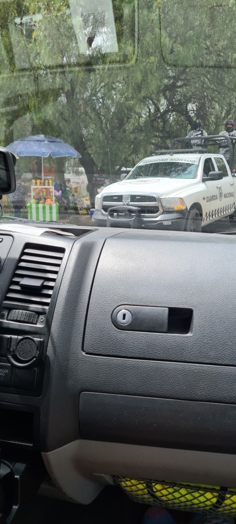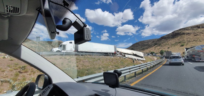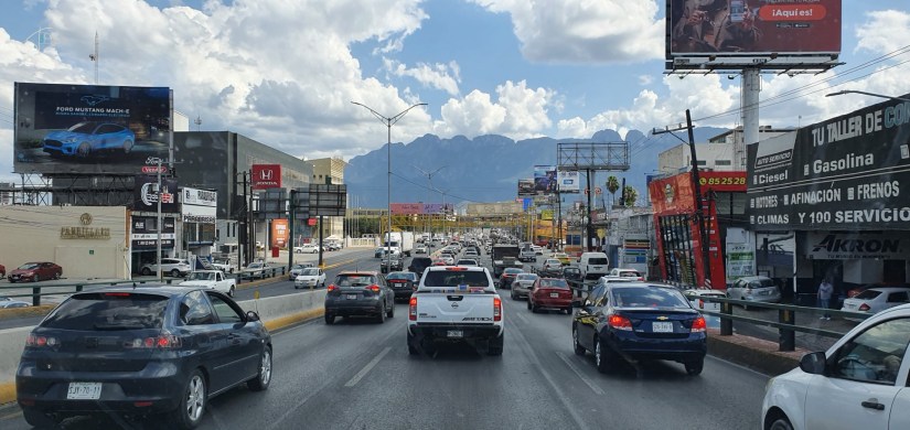 Dann ging es auf zu unserer ersten Station Monterrey und nun ja, dieser problemlose Start hat sich leider nicht fortgesetzt. Der Verkehr in Mexiko ist höllisch: Automassen, Trucks, kreuz und quer, keiner hält sich an Verkehrsregeln überholt wird in dem Glauben „der Andere bremst schon“. Wir fuhren leider auch noch zum Feierabendverkehr, und dann ist ein Auto einfach rüber gezogen, da wieder einmal eine Spur einfach geendet ist. Ohne Vorwarnung wurden aus 7 Spuren 4 (für die Franken: wie am Plärrer in Nürnberg, nur mit 10 mal so vielen Autos und mindestens doppelter Geschwindigkeit). Stefan musste also ausweichen, da aber hier wüst rechts und links auch auf dem Seitenstreifen überholt wird, und ein anderes Auto gerade rechts überholen wollte, haben wir das leider erwischt. Wir sind dann Beide rechts raus gefahren. Bei uns am Bus ging es (Transporterausführung ohne lackierte Stoßstange, stattdessen dankenswerterweise eine aus Plastik!) und passiert ist sowieso keinem etwas da nur Blechschaden. Leider war der Schaden am anderen Auto deutlich größer: Die Frontstoßstange hing ziemlich traurig am Auto. Ich sprang aus dem Auto, da ich im Gegensatz zu Stefan zumindest etwas des Spanischen mächtig bin (dachte ich zumindest). Da stand ich nun mit meinem „Spanisch für Angefangene, und die Hälfte schon wieder vergessen“ und Google Translate und diskutierte mit der Dame des anderen Wagens. Ich habe so viel verstanden, dass wir es nicht über Polizei machen sollten weil es nur Geld kostet, diese korrupt sind und uns Beiden Ärger bereitet (sie war sichtlich nervös). Kurz musste ich/wir den deutschen Impuls unterdrücken es mit Polizei und Versicherung zu machen und erinnerte mich an einen argentinischen Kollegen der seine Erfahrung zum Thema Polizei mal geteilt hatte, sowie die Geschichten über Polizeikorruption von Mexikaner:innen die wir getroffen haben und die uns so häufig immer wieder vor der Polizei gewarnt hatten. So entschied ich mich es ohne Polizei und Versicherung schnell auf die Hand zu regeln. Die Dame wollte 500 US$. Sie hing dann am Handy, offensichtlich mit jemandem der den Schaden einschätzen konnte. Auf 350 US$ konnte ich sie herunterhandeln; ihr Telefonpartner gab ihr anscheinend das OK. Dies wäre der EK-Preis für eine Frontstoßstange in Wagenfarbe in DE (so etwas weiß ich zufälligerweise aus eigener Erfahrung), also für mexikanische Verhältnisse definitiv überteuert. Dennoch wollten wir so schnell wie möglich aus der Situation raus. Denn auch wenn ich es nicht glaube, da der Schaden zu groß und die Situation zu unvorhersehbar war, bestand durchaus die kleine Möglichkeit dass der Unfall fingiert war.