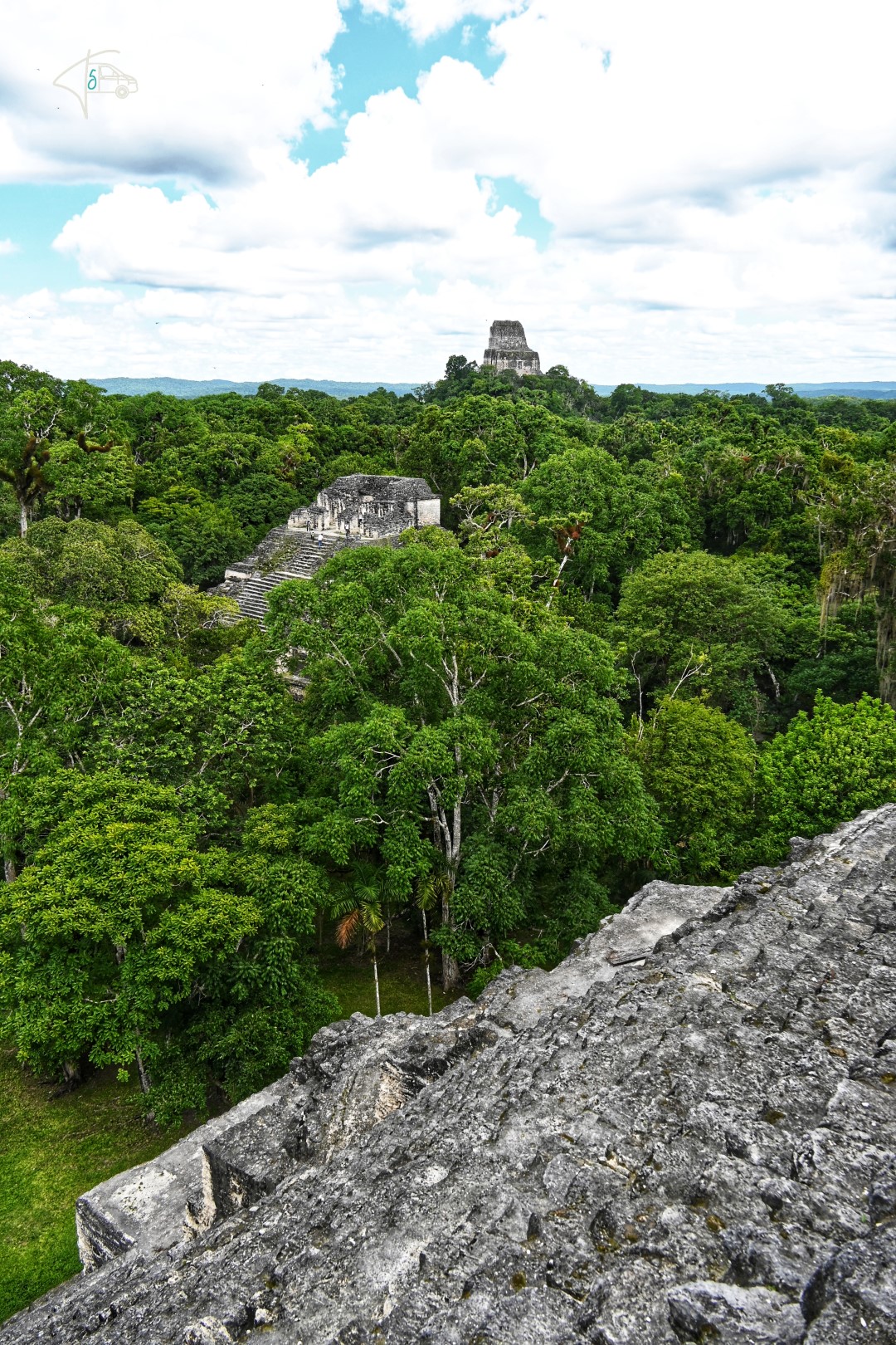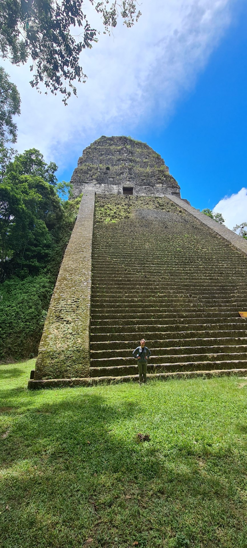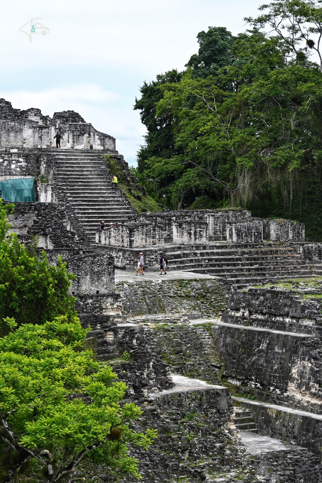 Am nächsten Tag ging es zu einer der legendärsten Mayastätten in Guatemala – Tikal. Die hohen Pyramiden im gleichnamigen Nationalpark sind eines der Highlights auf jeder Guatemala-Reise. Ursprünglich wollten wir es geführt machen, da es immer wieder Geschichten gab von Überfälle auf Tourist:innen im Nationalpark, da dieser sehr weitläufig und teils abgeschieden ist. Bei den horrenden Preisen entschieden wir uns dann aber doch dagegen, auch weil wir damit rechneten, dass ziemlich viel los sein würde. Warum? Es war Sonntag – und an diesem Tag haben alle Guatemaltek:innen freien Eintritt in Nationalparks, historische Denkmäler etc. Daher hieß es, auf nach Tikal. Die Fahrt dauerte ca. 1,5h (obwohl die Distanz nicht weit ist) denn einmal sind die Straßen nicht gerade die Besten, und um im Nationalpark die Fauna zu schützen wird die Geschwindigkeit überprüft und man darf nicht schneller als 45km/h fahren. Wie die Guatemaltek:innen das überprüfen? Sehr clever und kostengünstig wie wir fanden: Am Eingang des Parks steht jemand und schreibt penibel genau die Uhrzeit der Einfahrt auf dein Ticket und am Parkplatz zur Mayastätte wird das Ticket mit Uhrzeit kontrolliert und ausgerechnet wie schnell man gefahren ist. Tikal selbst war eine Wucht, die Pyramiden im Dschungel die unzähligen Nasenbären die über das Gelände streifen, und vor allem die fantastische Aussicht von den Pyramiden. Im Vergleich zu anderen Mayastätten sind hier Holztreppen aufgebaut um die Pyramiden zu schützen vor den Menschenmassen die hier hoch“trampeln“. Eine gute Idee, wenn man bedenkt wie viele Menschen hier jeden Tag rauf und runter laufen. Spannend ist auch, wie viel in Tikal noch nicht ausgegraben ist, und Schilder zu sehen (von Bodenradaraufnahmen) die einem Simulationen zeigen, wie es unter den „unscheinbaren“ Erdhügeln wohl aussehen muss. Wie viele dieser versunkenen Ruinen noch im Dschungel Zentralamerikas schlummern ist schwer zu sagen. Eine schöne Vorstellung und spannend zugleich, denn man sieht es einfach nicht. Für das ungeübte Auge (also unseres) ist es einfach nur ein Hügel.