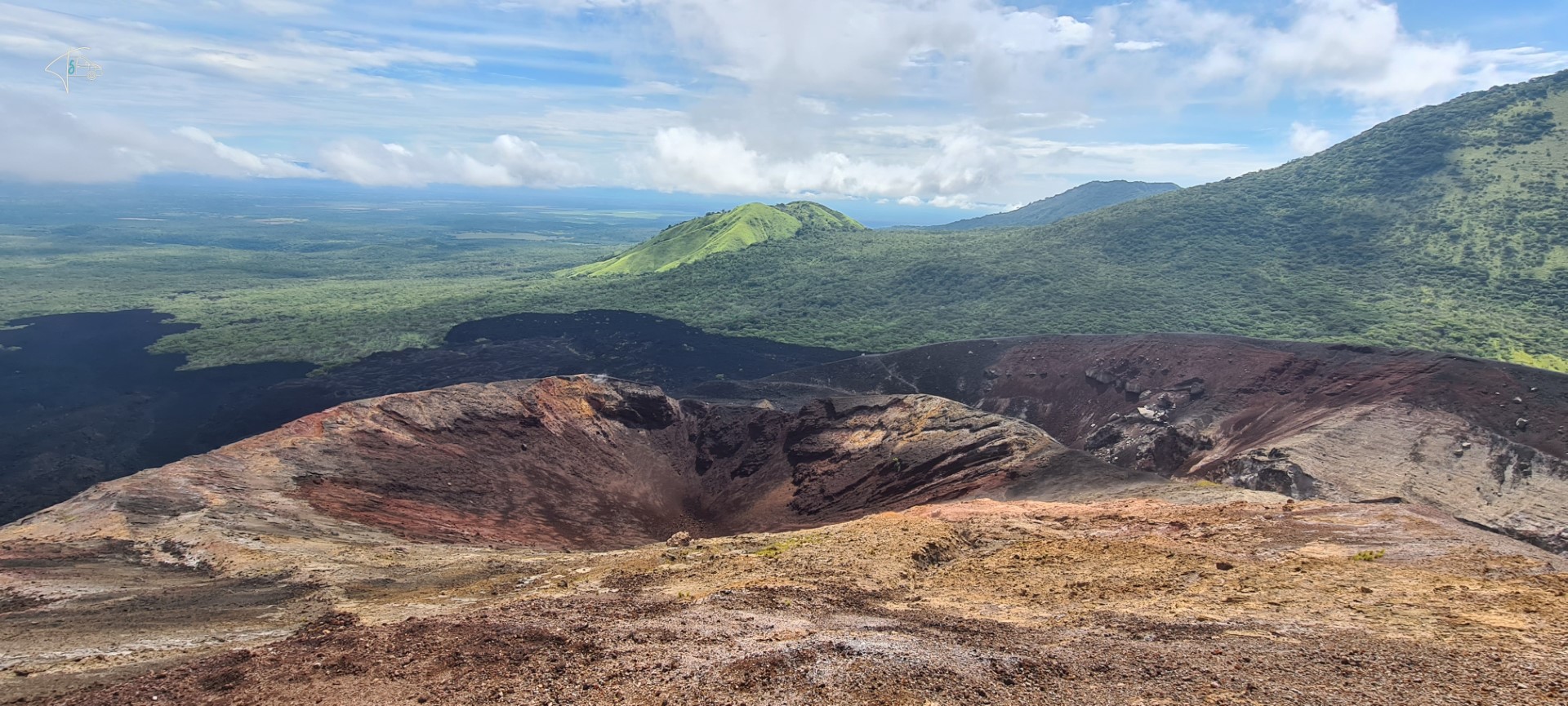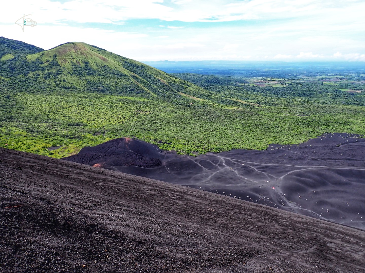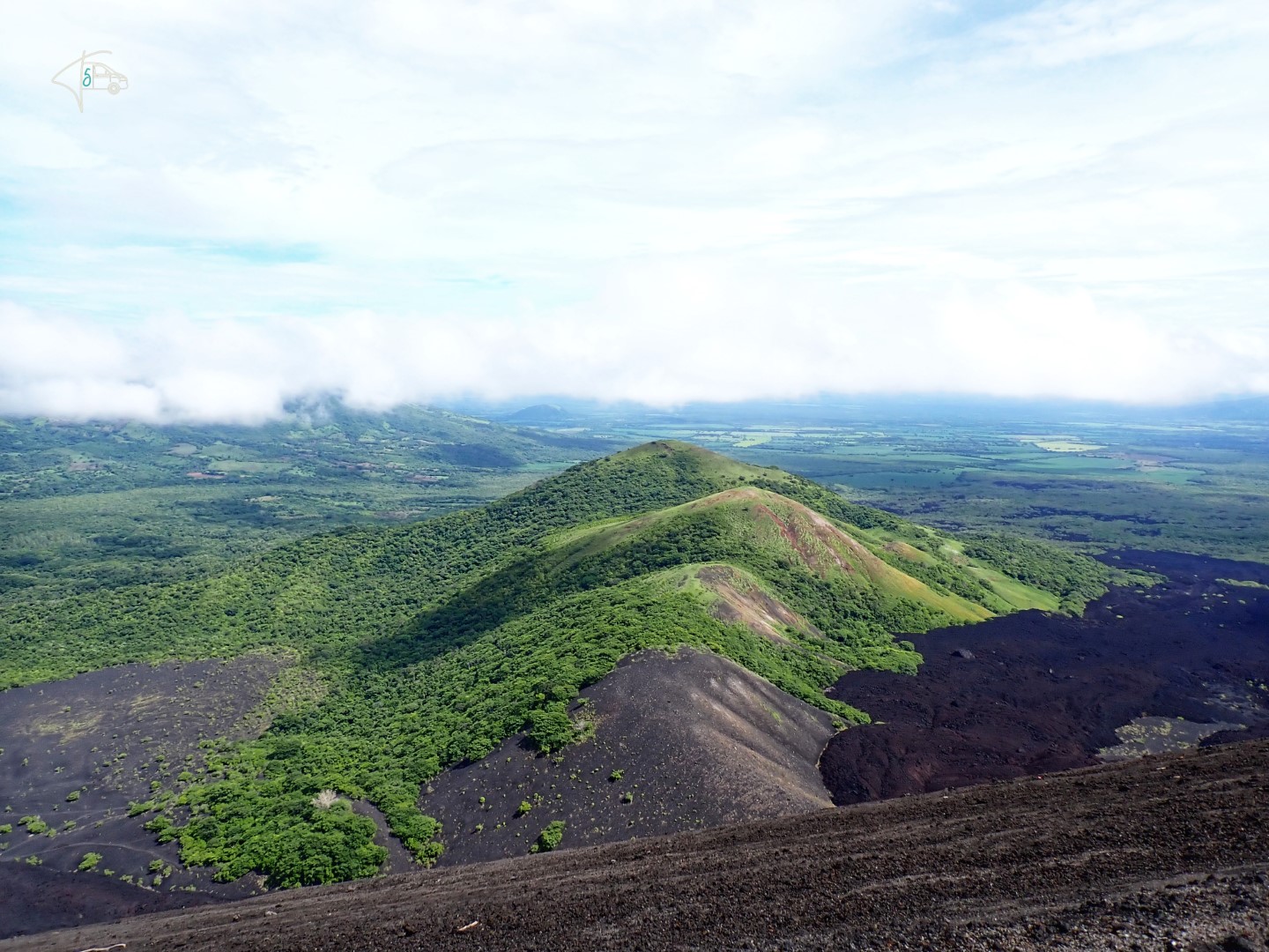 Nachdem es nachts und morgens die ganze Zeit geschüttet hatte wie aus Eimern, wurde das Wetter bei der Besteigung glücklicherweise immer besser. Der Weg hinauf ging flott und war sehr entspannt mit tollen Ausblicken. Cerro Negro ist schon länger nicht mehr ausgebrochen, aber wenn man oben am Kraterrand die ersten 1-2cm Vulkansand wegwischt, ist der Boden so heiß ist, dass man die flache Hand nicht mehr auflegen kann. Wenn man 4-5cm weiter gräbt, dann ist der Boden so heiß dass man darin Eier kochen kann oder Marshmallows schmelzen. Aus einigen Schlitzen/Spalten dringt heißer Qualm und wir hatten vor, von dort oben mit Schlitten herunterzu“rodeln“…