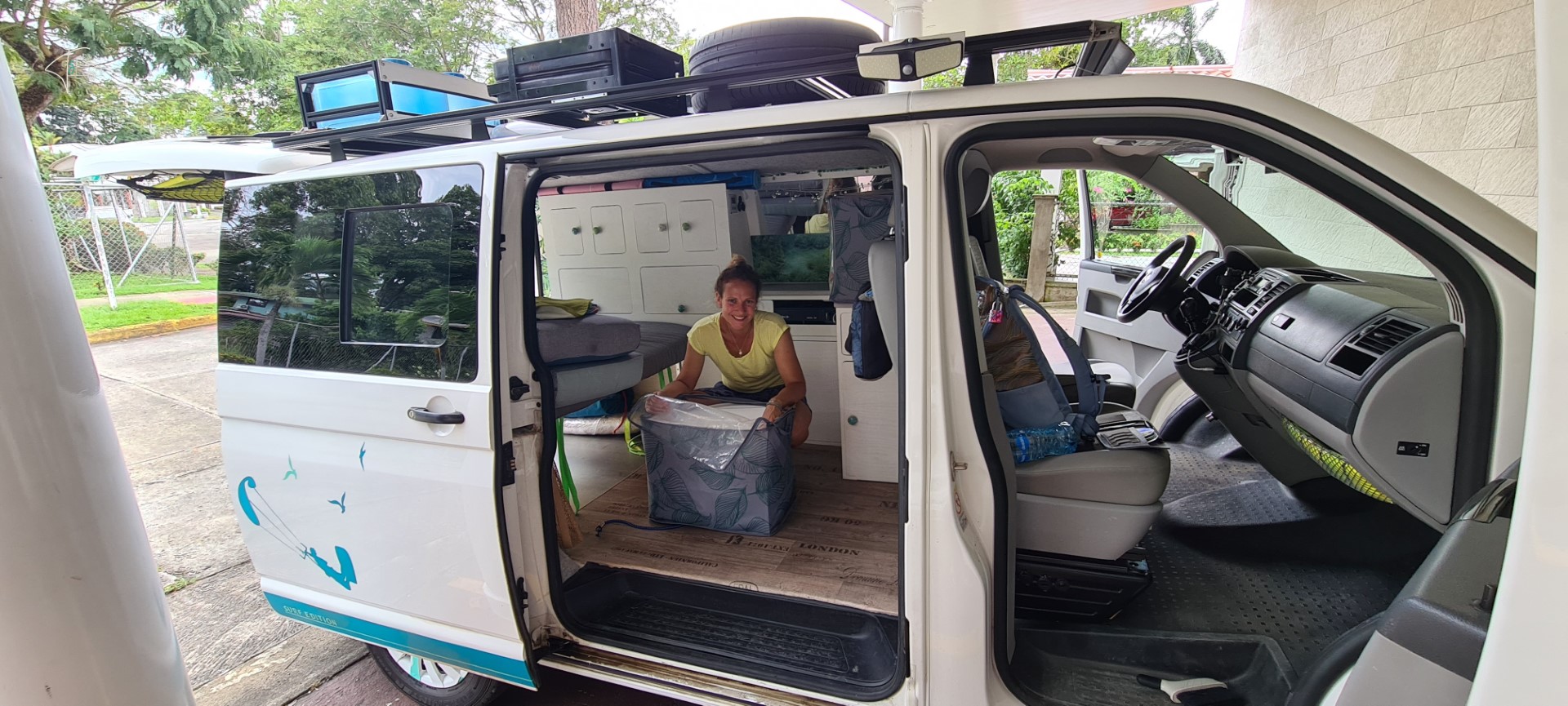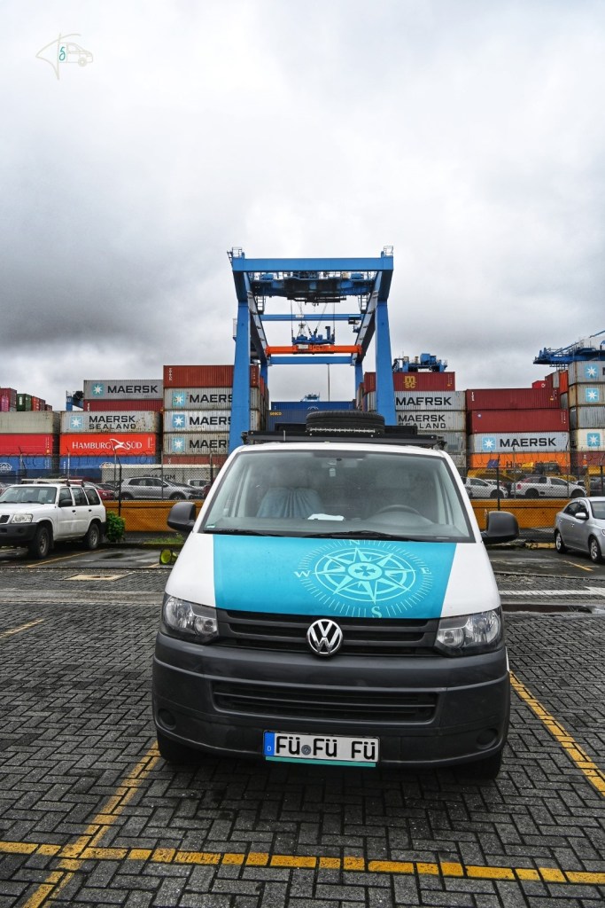 Von dort aus ging es zur finalen Fahrzeugabgabe im eigentlichen Hafengelände. Nach dem typischen, und inzwischen fast schon lieb gewonnen Papierkrieg, war eine letzte Inspektion an der Reihe – und die hatte es in sich: Zuerst kam ein großer Transporter angefahren mit Hundetransportboxen. Einer der Schäferhunde durfte aussteigen, und bekam in sehr liebevoller Manier Schühchen über seine Pfoten gezogen. So ausgerüstet wurde er zum T5 geführt und hat alles beschnuppert: Von der Heckklappe aus den hinteren Teil, den Wohnraum mit allen Schranktüren im offenen Zustand, die Beifahrerseite, die Fahrerseite, und zwei Mal ums Auto drum rum. Und obwohl ja klar war für uns, dass wir selbst nichts Verbotenes rein hatten… war die Erleichtergund doch groß, als das Ganze vorbei war. Es folgte eine weitere, visuelle Inspektion. Dass wir alles fein säuberlich verpackt und verzurrt hatten war dem Mann dabei völlig egal – er hat sich fast jede noch so kleine Box zeigen lassen. Zusätzlich dazu mussten die elektrischen Fensterheber auf beiden Seiten zeigen dass die Scheiben problemlos komplett hoch und runter fahren. Er hat nur gelächelt und gemeint „escondite típico de los principiantes“ (deutsch: „typisches Versteck der Anfänger“). Als letzter Schritt wurden gut und gerne 30 Fotos von innen und außen gemacht, um den Zustand bei Übergabe zu dokumentieren. Nachdem man den Schlüssel außen im Fahrerschloss stecken lässt (seeeehr komisches Gefühl nach 6 Monaten, in denen man jedes Mal das Abgeschlossen-Sein jeder Tür einzeln überprüft) wurde das finale Abgabedokument ausgehändigt, und das war’s. Wir sehen uns in circa 4 Wochen in Bremerhaven, T5 – hab‘ eine schöne Reise. 🚢